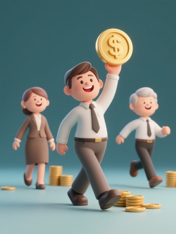 3D卡通风格,简约现代设计,单一元素图案规整排布,纯色背景,正面视角,(不同性别/年龄/职业的人物),身穿(符合其身份的服饰),面部洋溢着开心的笑容,右手高高举起一枚带有美元符号的金色金币,左手自然摆动,(人物特定姿态,如:自信行走/稳健站立/欢快跳跃),(人物身后/身旁有少量堆叠的金币),整体造型圆润可爱,色彩明快,光影柔和,无文字及二维码元素。