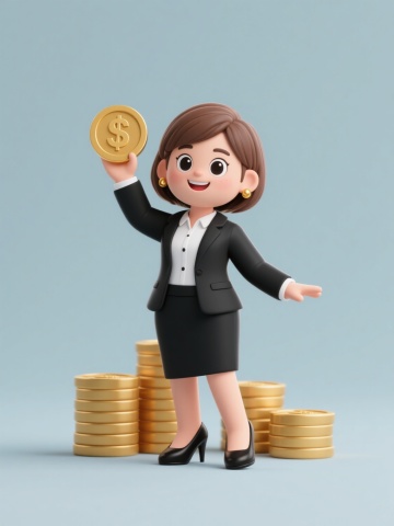 3D卡通风格,简约现代设计,纯色背景,规整排布的单一元素图案,系列素材集合中的一张,一个手持金币的人物形象,人物为3D渲染效果,面部表情生动,大眼睛,微笑,穿着职业装,黑色西装外套,白色衬衫,黑色裙子,黑色高跟鞋,棕色短发,金色耳环,右手高举一枚带有美元符号的金色金币,左手自然摆动,身后有几堆金色金币,整体造型简洁明快,风格统一,适合作为系列素材中的一张。