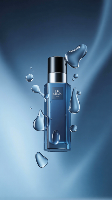 一张高度写实的产品图,主体为一个圆柱形或长方形的透明玻璃容器,容器内装有从顶部深蓝色渐变至底部浅蓝色的液体,液体清澈透明,具有细腻的光泽感。容器顶部配有一个银色的金属瓶盖,瓶盖表面光滑,有轻微的反光效果。整个产品置于纯白色背景上,光线从左上方45度角照射,在容器右侧投射出柔和的阴影,增强立体感。产品边缘锐利清晰,细节丰富,具有高端化妆品的精致质感和专业摄影的商业广告风格。