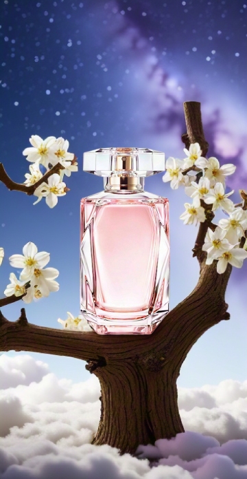 中式意境与3D重拟物结合,水墨晕染的水面倒影,玻璃质感香水瓶映衬粉樱,唯美感与梦幻感交织,尽显优雅东方美学。