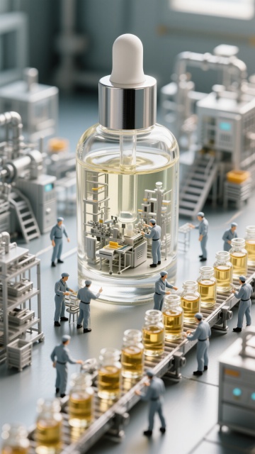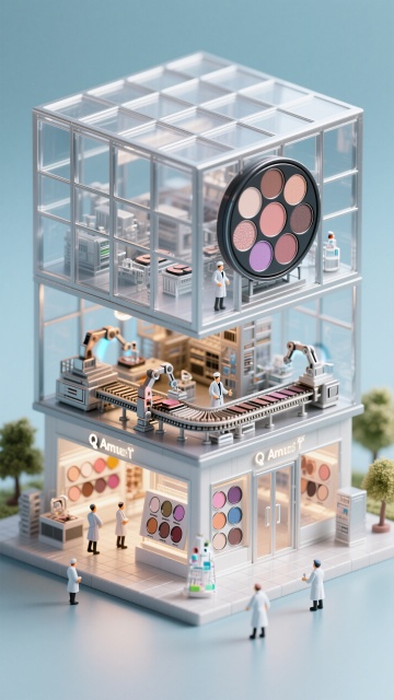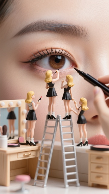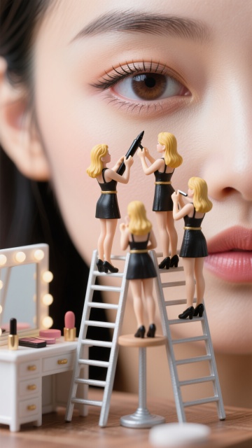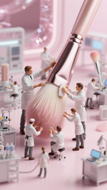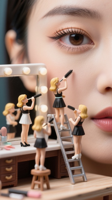 梦幻3D微缩艺术,可爱小人清洁面部,清新超现实主义风格。