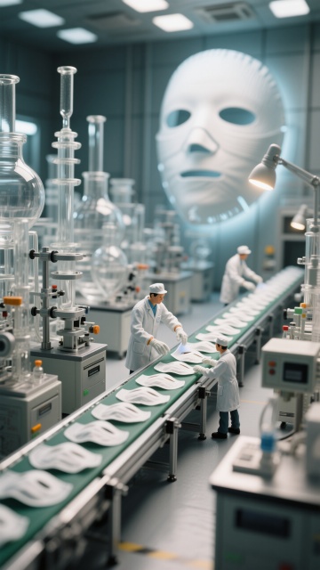 女性闭眼休憩,白色面膜如第二层肌肤般贴合全脸,几位迷你工程师操作光谱仪在面部工作台作业。整体淡绿色为主色调,明亮精致。