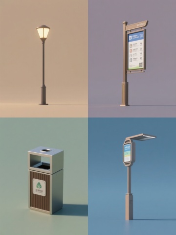 极简风格矢量插画,四个不同设计的路灯规整排列,每个路灯保持统一的现代简约设计语言,包含弯曲灯臂、圆柱形灯杆和发光灯泡等核心特征,采用纯灰色背景,无任何文字、logo或水印,整体画面干净整洁,线条平滑流畅,色彩为单一色调配合灯泡的黄色发光效果,呈现出清晰的图形感和设计感。