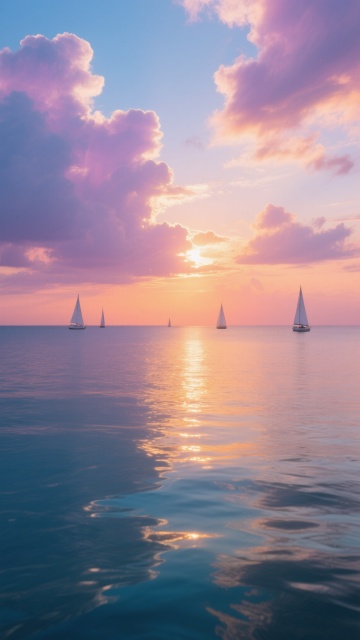 一片宁静的海面沐浴在壮丽的日落余晖中,天空中漂浮着被染成粉紫色和橙色的云彩,阳光从云层间穿透洒下,在海面上形成金色的波光粼粼的倒影,水面呈现出由深蓝向浅蓝渐变的色彩,远处的天际线将天空与海洋温柔分隔,整体画面呈现出超写实的摄影风格,光影柔和细腻,色调温暖而富有层次感,营造出宁静、祥和而又壮丽的氛围,海面上点缀着几艘远处的白色帆船,天边的云彩形态更加丰富多变,增添了画面的动感与细节。
