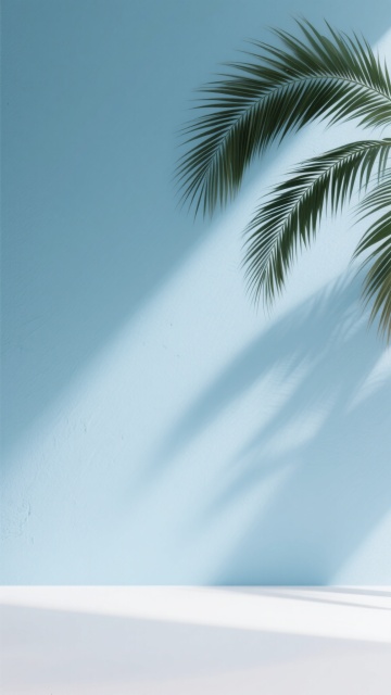 极简主义风格的白色背景,柔和的光线从左上角斜射而下,在浅灰色的墙面和白色的台面上投下飘逸的植物叶片投影,投影边缘模糊柔和,呈现出自然的光影层次感,整体画面干净、通透,营造出宁静、简约的氛围,保持投影风格样式。