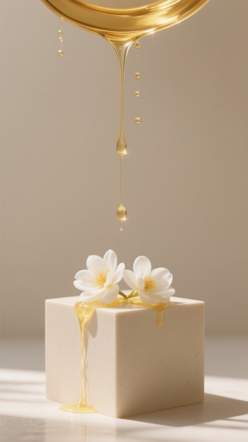鎏金风与液态风交织,3D质感瓶身悬浮于水面,清透油滴轻落涟漪,白花点缀,光影流动间尽显奢华优雅与唯美感。