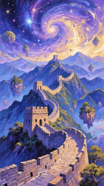 中国长城蜿蜒于连绵起伏的山峦之上,古老的城砖纹理清晰可见,烽火台矗立其间,展现出雄伟壮丽的气势。采用印象派艺术风格,以大胆奔放的笔触描绘,色彩上运用深蓝、紫色和金色为主调,营造出神秘而辉煌的氛围。背景是充满动感的漩涡状星云,点缀着闪烁的星辰和漂浮的奇幻岛屿,与长城形成鲜明对比,既保留了长城的历史厚重感,又增添了梦幻般的未来主义色彩,整体画面光影变幻莫测,充满视觉冲击力和艺术感染力。