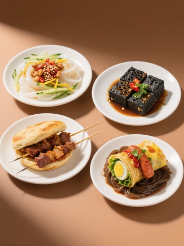 六份中式传统小吃在纯色背景上呈规整排布,简约现代风格美食摄影,左侧第一份为凉皮:白色瓷盘盛装,透亮凉皮卷起,表面撒有花生碎、黄豆、白芝麻,点缀翠绿黄瓜丝、豆芽,淋有红色辣椒油;第二份臭豆腐:灰黑色方块豆腐整齐码放,表面多孔,淋有深褐色酱汁,点缀绿色香菜段;第三份肉夹馍:金黄色酥脆外皮的圆形面饼,从中切开,内夹炖煮入味的褐色腊汁肉碎,肉汁饱满;右侧第一份烤串:多根金属签串起的烤羊肉串,肉质鲜嫩呈棕红色,表面撒有孜然粉、辣椒粉,边缘微焦;第二份煎饼果子:金黄色薄脆煎饼卷起,露出内部绿色生菜、浅褐色馃子,顶部可见白色芝麻;第三份烤冷面:黑色冷面片折叠成方块,表面刷有深褐色酱料,点缀白色洋葱碎、绿色香菜段、红色火腿肠片,整体光影柔和,采用侧上方单一光源,食物色彩鲜亮饱和,质感细腻,无文字、无logo、无水印。