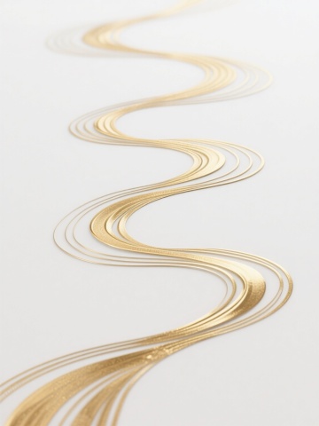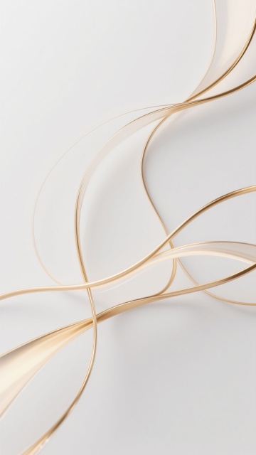 极简主义风格的白色背景,纯净的白色作为主色调,点缀极少的暖金色线条。画面中流动的白色曲面形态,具有柔和的曲线和光滑的质感,仿佛丝绸般飘逸。暖金色线条勾勒出曲面的边缘,形成优雅的轮廓。整体构图采用不对称的排版设计,曲面元素在画面中呈现出动态的流动感,营造出轻盈、高级、宁静的氛围。光线柔和均匀,强调曲面的立体感和光滑的材质,没有明显的阴影和高光对比。