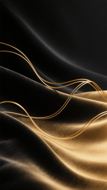 黑金渐变背景,深邃黑色与奢华金色交织,表面呈现细腻丝绒质感,具有柔和的褶皱光影效果。画面中央有自由流畅的金色曲线线条,线条纤细均匀,呈现出波浪状的动态美感,线条相互交织形成优雅的视觉韵律。整体画面留有大面积留白,构图简洁大气,营造出高级、简约、时尚的视觉氛围,光线柔和,金色线条在黑色背景上形成微妙的光影对比,凸显精致与奢华感。