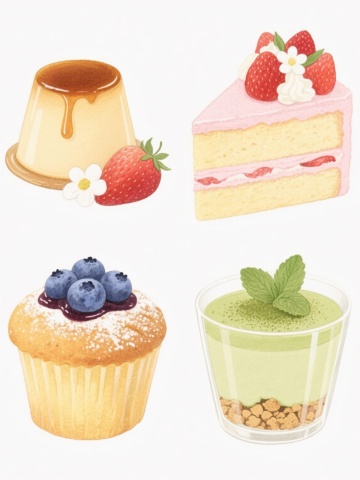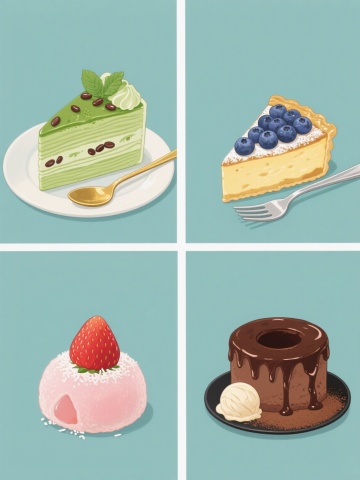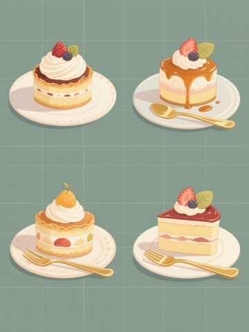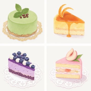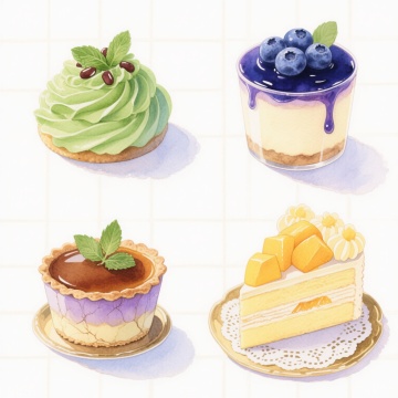 一系列4个水彩风格插画,每个插画中都有一个可爱的动物角色依偎在美味甜点旁,整体色彩变换为不同的纯色背景,保持水彩的透明晕染质感、柔和的光影过渡、细腻的笔触和温暖治愈的氛围,元素类目不变,每个画面分别展示:1. 粉色背景上,戴着蝴蝶结的小熊趴在草莓奶油蛋糕上,周围点缀着马卡龙和蓝莓;2. 蓝色背景上,抱着胡萝卜的小兔坐在香草冰淇淋甜筒旁,旁边有切片的橙子和薄荷叶;3. 黄色背景上,眯眼微笑的小猫依偎在巧克力熔岩蛋糕边,周围散落着曲奇饼干和樱桃;4. 绿色背景上,竖起耳朵的小狗趴在抹茶慕斯蛋糕旁,旁边有猕猴桃片和奶油泡芙,所有插画规整排布,构图平衡,色彩和谐,充满童趣和温馨感。