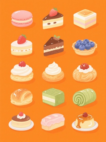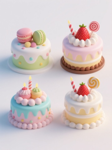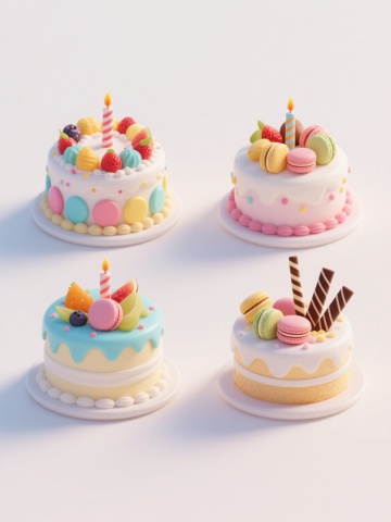 一套四个不同元素的系列素材集合,每个元素均采用圆润可爱的3D立体卡通风格,拥有光滑的表面质感和柔和的渐变色彩,高光部分明亮突出,底部带有淡淡的阴影效果,整体呈现出温馨甜美的氛围,元素被规整地排布在纯色背景上;第一个元素是一个蓝白渐变的双层生日蛋糕,顶部插着一根红白条纹的点燃蜡烛,旁边有一个黄色星星形状的饼干,蛋糕表面覆盖着白色奶油,边缘有波浪形花纹;第二个元素是一个粉紫渐变的三层冰淇淋甜筒,最上面是一个粉色的樱桃,甜筒表面有白色的糖粒,每一层冰淇淋的颜色由下至上逐渐变浅,底部是棕色的脆筒;第三个元素是一个黄绿渐变的圆形饼干礼盒,礼盒上系着一个粉色的蝴蝶结,礼盒表面有白色的波点图案,礼盒的盖子微微打开,露出里面的几块不同形状的饼干;第四个元素是一个橙红渐变的圆形甜甜圈,甜甜圈表面覆盖着橙色的糖霜,上面撒着白色的糖屑,中间的孔洞周围有一圈白色的奶油花边,顶部放着一颗红色的草莓。