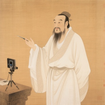 古典工笔风描绘古人,手持毛笔与现代VR设备互动,展现虚拟现实的古今交融。