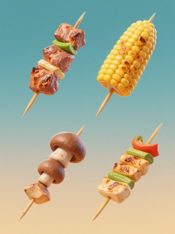六张纯色背景下的现代简约风格街头小吃素材图,每张图中单一食物居中排布,整体呈现统一的高清晰度美食摄影风格,主色调为食物本身的自然色泽,光影采用柔和的顶部侧光,突出食物表面的质感与细节,具体包括:第一张是两根表面切有螺旋花纹、撒满芝麻和辣椒粉的烤肠,橙红色的肠体油光锃亮,置于竹签之上;第二张是几串缠绕紧实的烤面筋,深棕色的面筋表面布满细密的烤痕,均匀涂抹着棕红色酱料,点缀着白色芝麻和绿色香菜碎;第三张是方块状的臭豆腐,表面呈焦黄色并带有蜂窝状孔洞,淋有深褐色的酱汁,点缀着红色的辣椒酱和绿色的葱花;第四张是几串铁板鱿鱼,鱿鱼须卷曲饱满,呈现出诱人的浅褐色,表面覆盖着亮泽的油光和细密的黑胡椒粒,肉质紧实有弹性;第五张是几串烤肉串,肉块大小均匀,呈棕红色,表面烤得焦香,撒有孜然粉和辣椒粉,肥瘦相间,油汁欲滴;第六张是一块炸鸡排,金黄色的外皮酥脆,表面有明显的油炸纹理,边缘微微翘起,肉质鲜嫩多汁,表面撒有少许盐粒和黑胡椒。所有食物均无文字、logo及水印,背景为纯白色,构图简洁,突出食物主体。