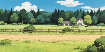 插画风虚拟自然,清新舒适,围栏环绕绿茵草地,蓝天白云映衬森林。