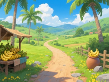 清新插画风,虚拟自然景观,绿意盎然,香蕉点缀,营造夏日田园氛围。