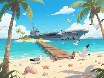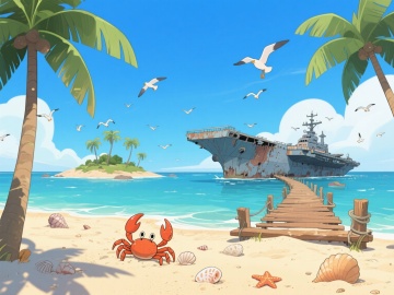 清新插画风,拟人螃蟹与废弃航母,热带海岛背景,卡通感十足。