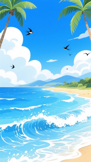 清新插画风,卡通感海岛场景,椰树、渔船与海鸥,营造悠闲夏日氛围。