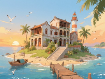 手绘,插画,动漫,夏日。闽南建筑,厝,双层的厝,多层的闽南骑楼,闽南建筑群,多层建筑体,南洋风建筑,闽南建筑综合体,台阶,建立在岛上,椰树,草,植物,沙滩,周围都是海,孤岛,海鸥,码头,木船。厝的改造,现代的厝。浪漫的,黄昏。艺术,美术,灯塔,落日。