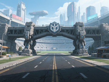 SBCJ,带有标志的桥梁,机甲风格地面,干净的路面,未来城市背景,科幻风格细节丰富的2D游戏背景,奥丁石制竞技场元素,高细节官方艺术图,体育竞技场场景,建筑,柏油路面,概念艺术