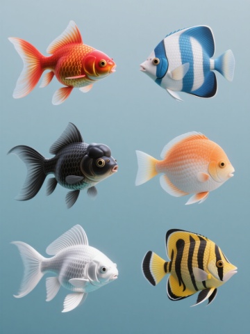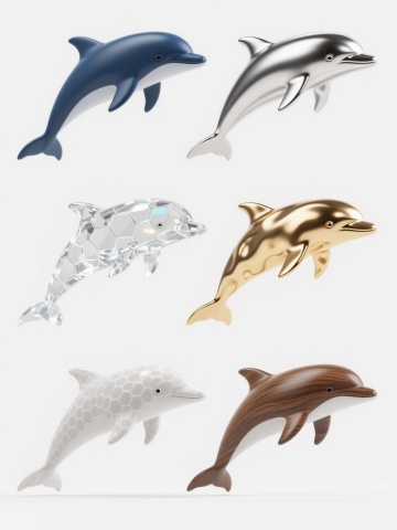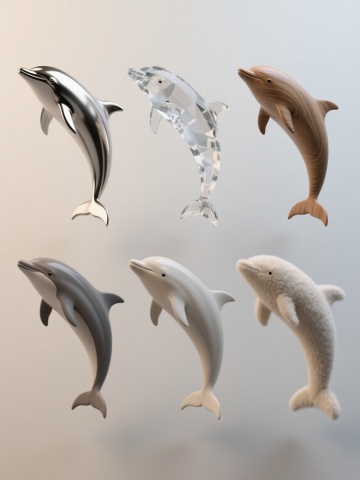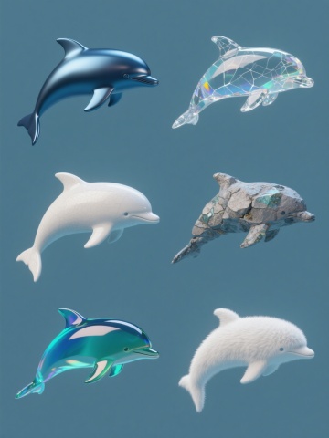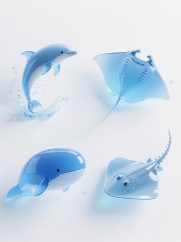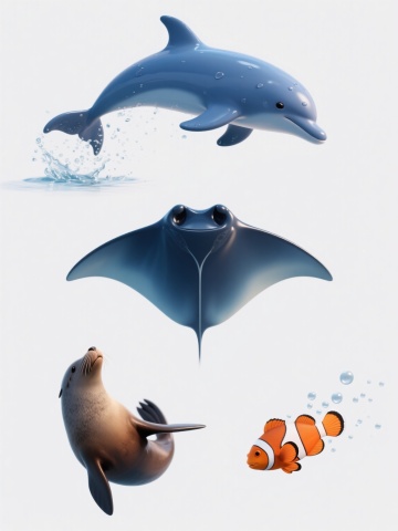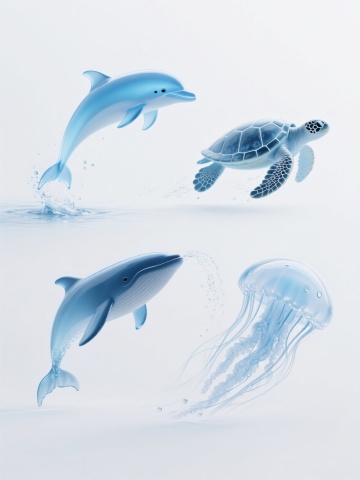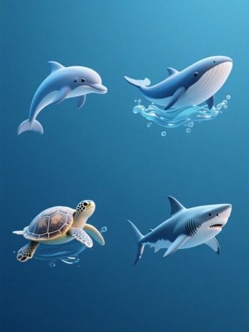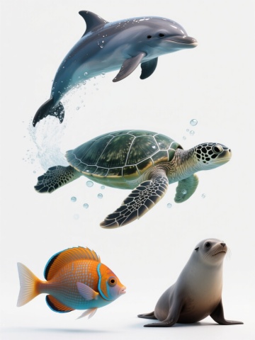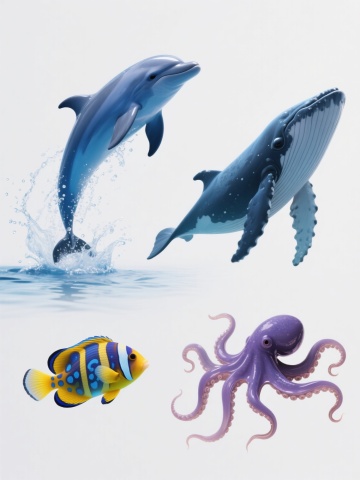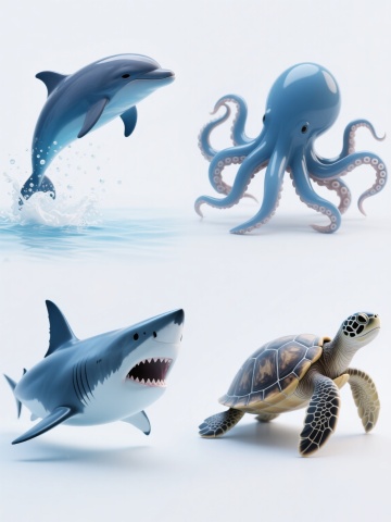 一组四个海洋动物的插画集合,保持与原图一致的3D写实风格,统一使用纯白色纯色背景。每个动物都具有光滑细腻的皮肤质感,带有自然的光影过渡和湿润的光泽感,身体周围有飞溅的水珠和气泡细节。从左到右、从上到下依次排列:第一幅是跃出水面的蓝色海豚,身体呈优美弧线,尾鳍向后伸展,头部微微抬起;第二幅是绿色海龟,四肢展开,头部伸出,龟壳上有清晰的纹理和光泽;第三幅是橙白相间的小丑鱼,身体呈流线型,尾鳍和胸鳍舒展,眼睛圆睁;第四幅是紫色章鱼,八条触手自然下垂,头部圆润,眼睛突出,触手上有吸盘细节。整体构图规整对称,每个动物占据相同大小的空间,保持一致的光照方向和阴影效果,形成和谐统一的系列感。