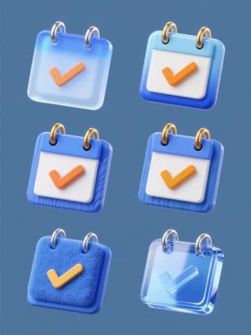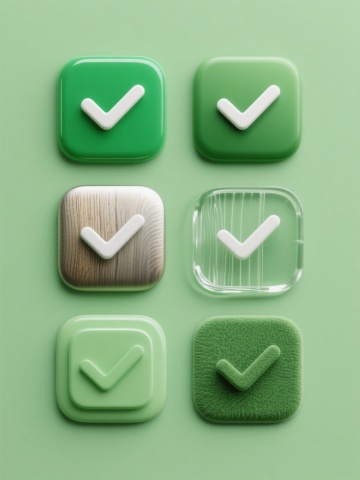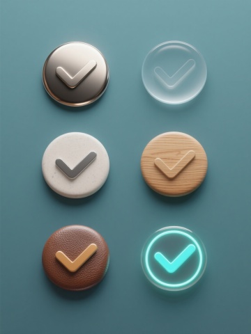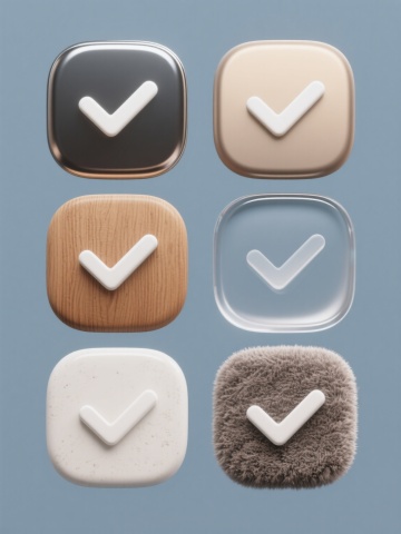 六个「对错」造型图标,分为上下两行对齐排列,每行三个图标,浅色背景。三个对勾图标分别采用不同配色、样式和材质:第一个为绿色圆形轮廓搭配绿色填充的扁平风格对勾,线条流畅圆润;第二个为蓝色渐变金属质感对勾,边缘有高光和阴影,呈现出立体光泽效果;第三个为橙色手绘风格对勾,线条带有细微的笔触纹理,色彩饱满温暖。三个叉号图标同样各具特色:第一个是红色圆形轮廓搭配红色填充的扁平风格叉号,造型简洁明了;第二个是紫色磨砂玻璃材质叉号,半透明质感,边缘柔和;第三个是黄色木质纹理叉号,表面有自然的木纹肌理,呈现出质朴的材质感。所有图标保持统一的圆形外框比例,整体视觉风格协调,色彩鲜明且对比清晰,信息传达直观高效,符合现代简约的设计美学。