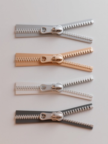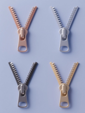 纯色背景上的软3D风格金属拉链系列素材集合,四个完全不同颜色的金属拉链独立呈现且规整排布,每个拉链均保持金属质感、V字形链牙排列和中央拉头的立体结构,柔和的光影过渡,平滑的3D表面,简洁的设计感,无文字和二维码。