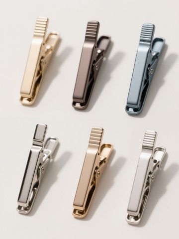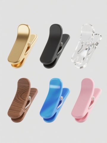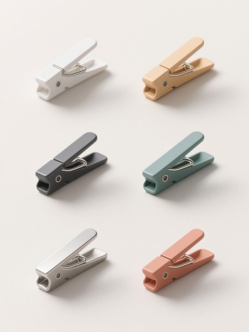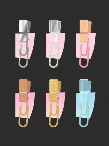 一张纯色背景的设计图,展示了6个完全不同材质的同元素、同造型的系列夹子素材集合,这些夹子规整排布。夹子的造型保持一致,为经典的回形针式设计,带有弯曲的顶部和夹纸的部分。6个夹子分别采用了以下材质:1. 光滑的塑料材质,呈现出柔和的淡粉色,带有细腻的光泽感;2. 磨砂金属材质,呈现出银灰色,表面有细微的磨砂纹理;3. 透明水晶材质,清澈透明,带有淡淡的蓝色调,边缘有折射光效;4. 木质材质,呈现出温暖的浅棕色,木纹清晰可见;5. 皮革材质,呈现出深棕色,表面有皮革特有的纹理和光泽;6. 陶瓷材质,呈现出纯白色,表面光滑细腻,带有轻微的哑光效果。每个夹子都夹着一张淡粉色的纸片,纸片的边角有轻微的弧度,整体设计简洁、现代,具有很强的视觉统一性和系列感。