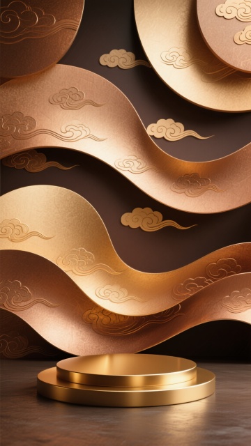 3D渲染的展示背景,整体采用温暖的金色、铜色和深棕色渐变色调,带有细腻的金属质感和磨砂纹理,表面装饰有连续的祥云纹样浮雕图案。画面由多个大小不一、形态变换的曲面构成,它们以交错层叠的方式排列,形成丰富的空间层次感和柔和的光影过渡效果。底部中央放置一个圆形的金色展台,展台表面光滑并反射着环境光,周围环绕的曲面造型在保持原有色调和纹理的基础上,变换为更具流动感的波浪形态,整体构图呈现出典雅而现代的东方美学风格,光影柔和,氛围庄重而富有高级感。
