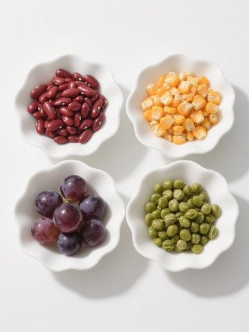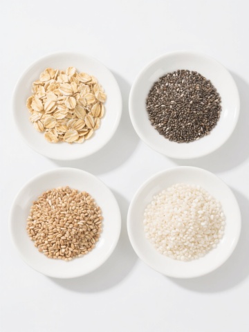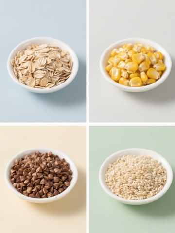 一组4张的健康早餐食品系列素材,每张均为白色陶瓷碗盛装不同谷物早餐,配以同色系塑料勺子,采用高分辨率产品摄影风格,光线柔和均匀,从上方45度角俯拍,背景为纯净的纯色(分别为浅蓝、浅粉、浅绿、浅灰),碗内食材颗粒清晰、质感饱满,液体呈现自然光泽,整体构图居中对称,画面简洁干净,4张图片规整排列成2x2网格,保持一致的光影效果和写实细腻的视觉风格,分别展示:1. 牛奶泡燕麦片,2. 酸奶配蓝莓谷物脆,3. 椰奶水果麦片,4. 红豆薏米营养粥。