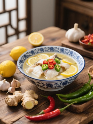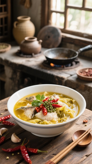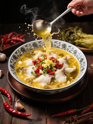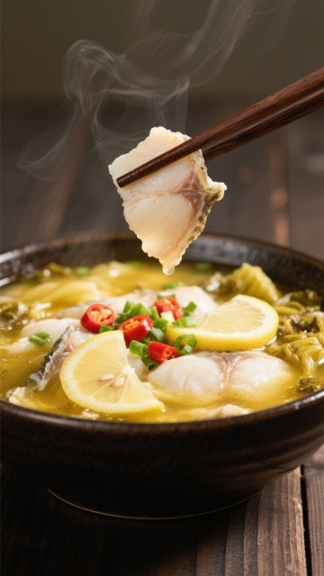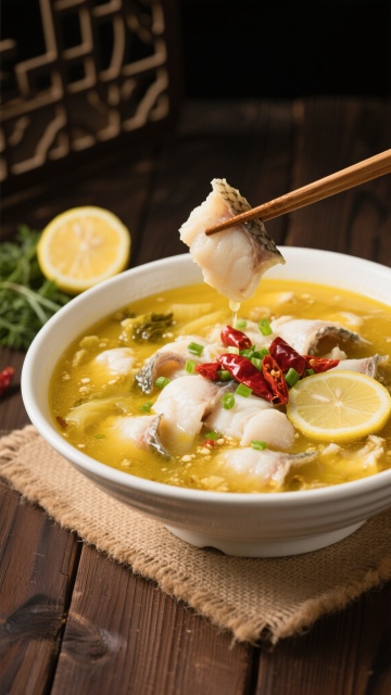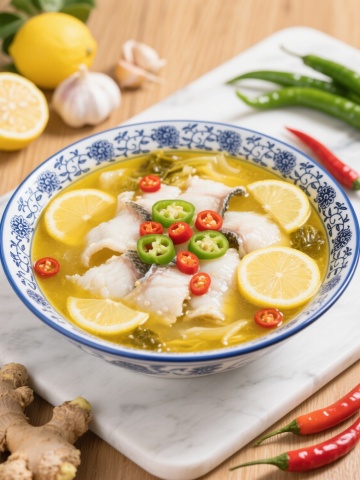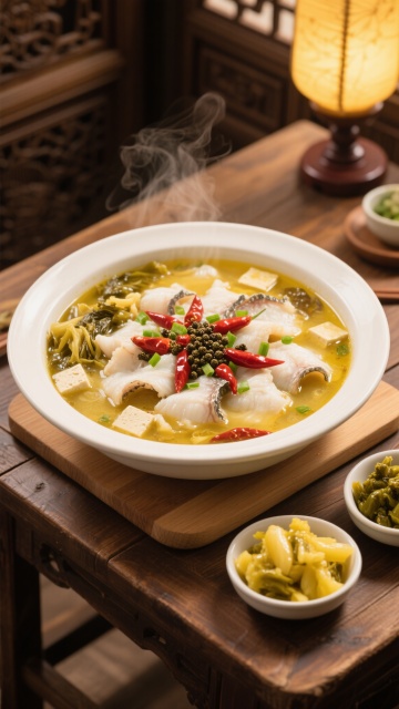 精致的白色陶瓷锅中装满金黄色酸汤鱼片,雪白的鱼片鲜嫩饱满,表面撒有鲜红辣椒段和翠绿葱花,汤汁清澈透亮,点缀着酸菜与豆腐块,锅具置于木质砧板上,周围摆放两碗腌黄瓜配菜,整体采用温暖柔和的自然光线下的写实美食摄影风格,主色调为金黄、雪白与木色,光影柔和细腻,突出食物的质感与温度,背景变换为现代简约的中式餐厅环境,浅色木质餐桌搭配灰色布艺座椅,墙面装饰水墨画,营造雅致温馨的用餐氛围。