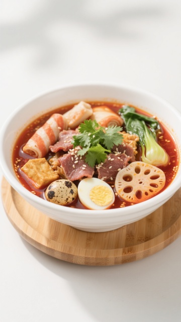 高质感餐饮美食摄影,深色背景突出食物色彩,特写沸腾的红色汤底火锅,蒸汽缭绕,筷子夹起鲜嫩肉片,周围摆放多种配菜如蔬菜、丸子、菌菇,食材新鲜饱满,光影对比强烈,高光凸显汤汁光泽与肉质纹理,暖色调营造热烈诱人氛围,不同角度展现火锅餐桌的丰盛场景,细节丰富,构图聚焦食物主体,具有强烈的食欲感和视觉冲击力。