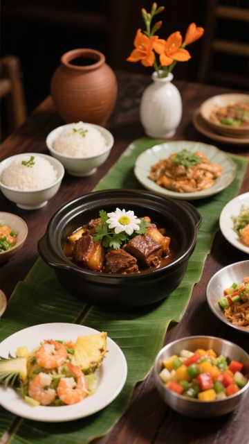高质感美食摄影,暖色调灯光营造温馨氛围,深色木质餐桌上铺着绿色芭蕉叶,中央摆放黑色陶锅盛装的红烧大块肉,表面点缀白色菊花与绿色香菜,周围环绕多道菜肴:左侧两碗白米饭撒有葱花,前方白色瓷盘盛有菠萝虾仁沙拉,右侧银色金属碗装彩色蔬菜丁,背景有棕色陶罐与插着橙色花朵的白色瓷瓶,整体构图饱满,食物细节清晰,光影层次丰富,营造出丰盛诱人的餐饮场景。