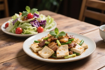 清新中式实景,豆腐配肉香,绿叶点缀,自然光下尽显家常美味。
