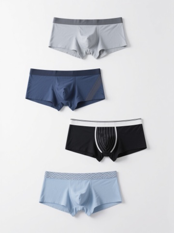 一组4款不同设计的女性内衣系列产品展示,保持原图的极简白色纯色背景,采用相同的高清晰度商业摄影风格,光线均匀柔和,正面俯视角,突出内衣的材质细节和结构设计。每件内衣均为浅色系(浅蓝、浅粉、浅灰、米白),保留精致的蕾丝、透气网眼等材质特征,但在款式上各具特色:1. 简约无钢圈三角杯配细肩带;2. 带精致蝴蝶结装饰的半杯文胸;3. 前扣式美背设计内衣;4. 法式薄款bralette。4件内衣呈2x2网格状规整排布,间距均匀,整体构图平衡对称,适合电商产品系列展示。