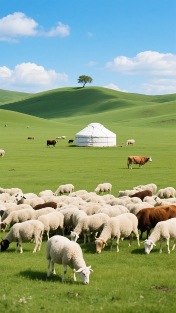 真实照片,辽阔的草原风光,画面中央偏后位置有一座白色的蒙古包,蒙古包周围散落着几只牛羊,前景是一大群正在低头吃草的羊和牛,毛色有白色和棕色,绿色的草原一望无际,远处是起伏的绿色丘陵,丘陵上有一棵孤零零的树,天空湛蓝,飘着几朵白色的云彩,阳光明媚,光线柔和,营造出宁静、自然、开阔的氛围,色彩鲜艳,细节清晰,具有强烈的空间感和层次感。