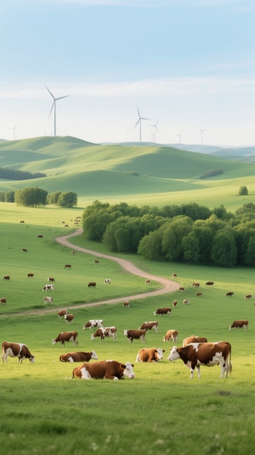 一片广阔无垠的大草原,草原上覆盖着鲜嫩的绿色青草,几头棕白相间的牛正在低头悠闲地吃草,远处是连绵起伏的绿色丘陵,天空湛蓝,飘着几朵洁白的云彩,阳光明媚,光线充足,整个画面充满了宁静、自然、生机勃勃的氛围。