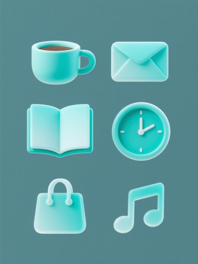 一套6个完全不同元素内容的软3D风格图标系列素材集合,规整排布在纯色背景上。每个图标都具有柔和的3D质感,圆润的边角,细腻的光影过渡,整体色彩变换为清新明快的蓝绿色调。图标元素包括:1. 简约的咖啡杯,带有小手柄和杯口弧线;2. 打开的书本,书页边缘微卷;3. 信封形状,右上角有一个小封口;4. 圆形时钟,带有简单的时针和分针;5. 购物袋,有两个手提带;6. 音乐音符,线条流畅自然。所有图标保持一致的软3D风格和视觉语言,色彩和谐统一,形成一个完整的图标系列。