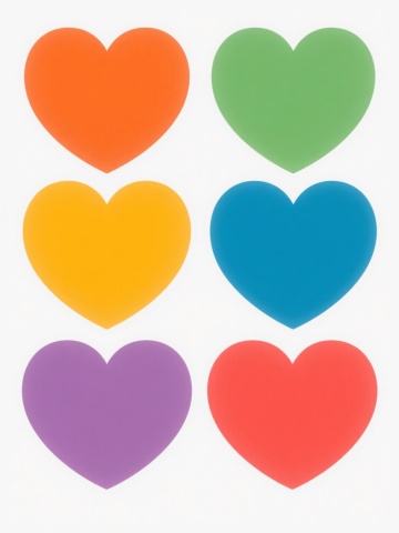 一组六个纯色背景的软3D风格爱心图标系列素材集合,每个图标均为两个相互依偎的心形组成,保持相同的流畅线条和形态结构,规整排布。第一个爱心为明亮的红色,第二个为温暖的橙色,第三个为阳光的黄色,第四个为清新的绿色,第五个为宁静的蓝色,第六个为优雅的紫色,每个爱心图标都具有柔和的3D渐变光影效果,背景为纯白色,整体呈现出简洁、统一且色彩鲜明的视觉效果。