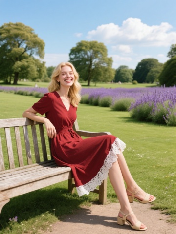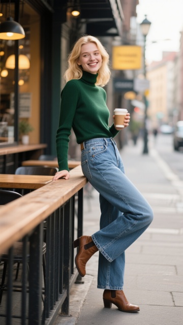 一位金发欧美模特,她正优雅地漫步在洒满阳光的秋日落叶林间,微微侧身回眸,脸上洋溢着灿烂迷人的笑容。她身着一件焦糖色针织开衫,内搭白色高领打底衫,下身搭配一条复古格纹半身裙,脚踩棕色短靴。阳光透过树叶的缝隙在她身上形成斑驳的光影,她的金色长发被微风轻轻吹起,一只手自然地提着一个皮质手提包,另一只手轻轻拂过一片飘落的枫叶,整体画面呈现出温暖、惬意、充满秋日氛围的高级感人像摄影风格,色彩明亮柔和,光影层次丰富,背景中点缀着红黄相间的枫叶和远处模糊的林间小径。