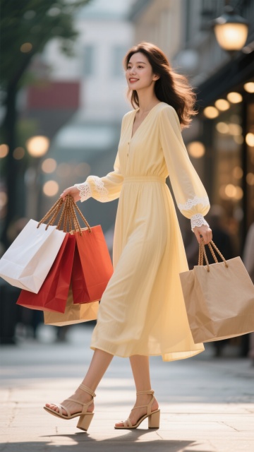 一位穿着米黄色长袖连衣裙的女性,裙摆自然垂落,袖口有精致的白色蕾丝装饰,她正提着多个购物袋行走,购物袋包括白色、红色和米色等不同颜色,搭配棕色的绳制提手。她穿着米色的粗跟凉鞋,脚踝处有细带设计。背景是模糊的城市街道,温暖的灯光形成散景光斑,营造出舒适惬意的购物氛围。整体画面采用写实风格,光线柔和,以暖色调为主,光影过渡自然,突出女性优雅的姿态和购物后的满足感。