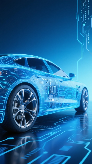 蓝色渐变背景,从深蓝到浅蓝的平滑过渡,光线从下方柔和照亮,营造出科技感与未来感的氛围。一辆轿车的侧面轮廓,以蓝色线条和电路板纹理构成,内部可见复杂的电子元件和线路结构,车轮为多辐式轮毂设计,带有金属光泽。车身下方有明亮的反光效果,地面由蓝色的科技感线条和电路图案组成,右上角有向上延伸的线条和数字代码图形,整体呈现出透明的全息投影质感,风格统一的科技主题设计,无文字信息。