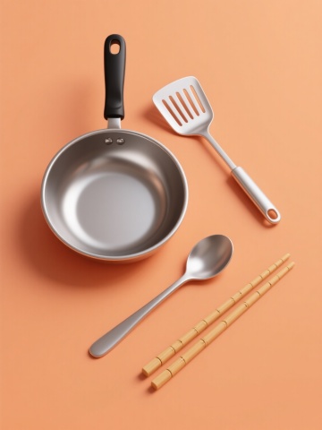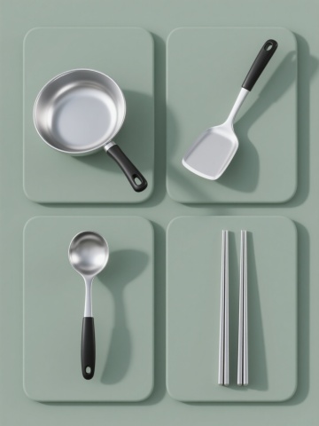 一系列4个现代简约风格的厨房家电产品展示图,纯色背景,每个产品单独置于画面中央,保持高清晰度和真实质感,光线柔和均匀,呈现出光滑的金属和塑料材质。第一个是黑色铸铁炒锅,带长柄和侧耳;第二个是银色不锈钢平底锅,带隔热手柄;第三个是白色电饭煲,带有显示屏和控制按钮;第四个是黑色微波炉,带透明玻璃门和控制面板。整体色彩协调统一,布局规整,每个产品图像风格一致,适合作为产品目录或电商平台展示素材。