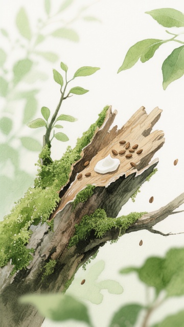 手绘水彩风格插画,画面中心是覆盖着鲜绿色苔藓的原木,断裂的树干纹理清晰可见,旁边散落着棕色的小颗粒种子,一团白色的膏体置于其上,背景是模糊的绿色植物叶片,整体色调柔和,笔触轻盈通透,水分晕染效果自然,营造出清新自然的有机氛围,植物和木质元素的轮廓用流畅的线条勾勒,细节处保留水彩特有的颗粒感和色彩渐变。