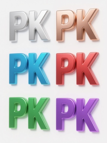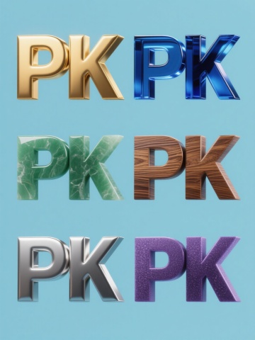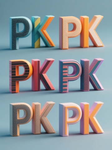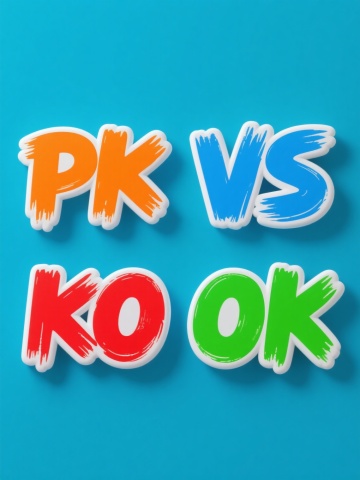 一组四个规整排布的游戏风格标题字设计,每个标题字均采用锐利的几何切割造型、厚重的立体描边、高饱和渐变色填充和强烈的亮部高光处理,保持与原图一致的动感斜向构图和金属质感,背景为纯色。从左到右、从上到下依次为:1. 橙红色渐变"PK",2. 蓝紫色渐变"VS",3. 绿黄色渐变"KO",4. 粉青色渐变"OK",整体形成色彩各异但风格统一的系列素材集合。