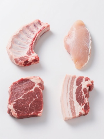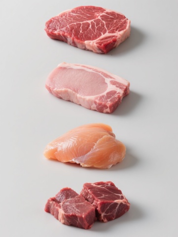 一块精心烤制的厚切牛排,表面呈现出诱人的深棕褐色烤痕,纹理清晰,边缘微焦,内部肉质呈现鲜嫩的粉红色,散发着多汁的光泽,白色背景,牛排被切成几片堆叠在一起,立体感强,光影效果突出,肉质纹理细腻,质感真实,散发着浓郁的烤肉香气。