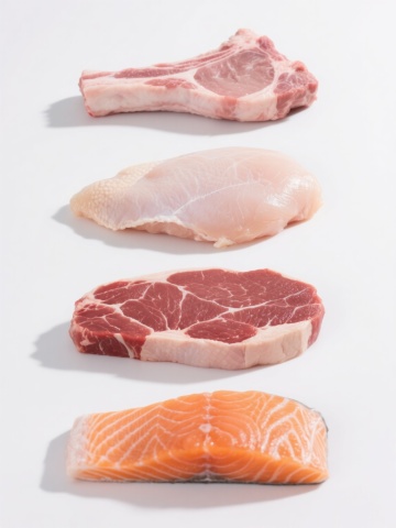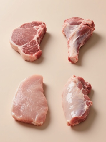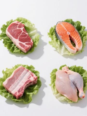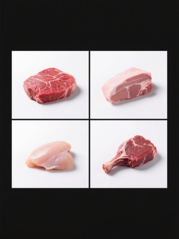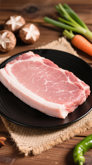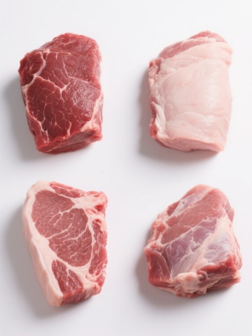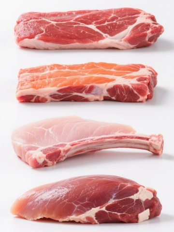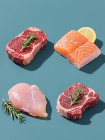 高品质写实风格的新鲜生肉特写,多片纹理清晰、肥瘦相间的粉红色肉片整齐排列,表面富有光泽,肉质细腻且富有弹性,底部散落着晶莹的冰块,背景有鲜红的樱桃番茄和翠绿的迷迭香枝叶点缀,整体采用深色背景突出食材的新鲜度,光线从斜上方照射形成柔和的高光与自然阴影,营造出高端食材的质感与纯净氛围。