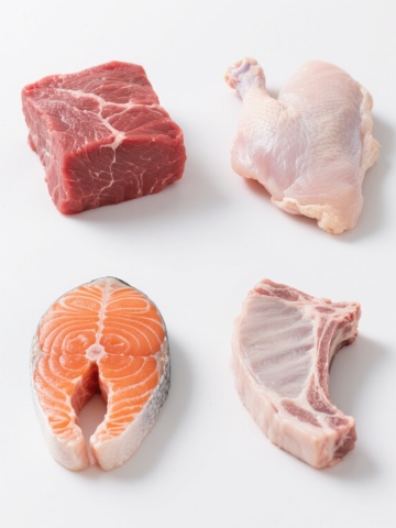 一位穿着黑色围裙的男性厨师,双手正握着一把锋利的厨刀,在木质砧板上精准地切割新鲜的红色生肉块,砧板上和旁边的竹篮里也堆放着多块纹理清晰的肉块,整体画面采用暖色调自然光摄影风格,光线从斜上方照射,突出肉块的鲜嫩质感和厨师手部的肌肉线条,背景为简洁的深色木质墙面,营造出专业、质朴且充满生活气息的厨房环境,高分辨率细节清晰,无任何文字和水印。