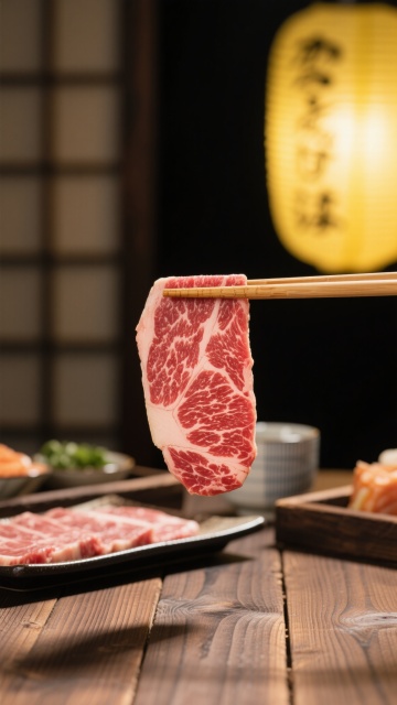 一块新鲜的生牛肉片,纹理清晰,脂肪分布均匀,被一双竹筷子夹起,悬停在日式居酒屋风格的木质餐桌上,背景中有暖黄色的灯笼和模糊的日式料理食材,整体呈现出精致的美食摄影风格,光线从斜上方照射,突出牛肉的鲜嫩质感和光泽,深色背景衬托出牛肉的鲜艳色泽,营造出温馨而诱人的用餐氛围。