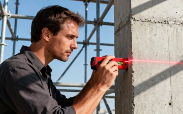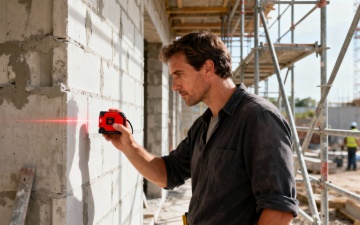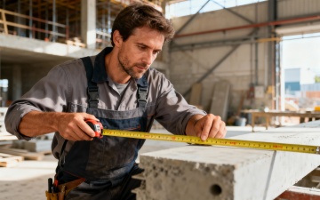 一个工人正在篮球场上进行篮球架安装前的准备工作,他穿着蓝色工装,戴着安全帽,手里拿着扳手和卷尺,地面上放着篮球架的金属部件和工具包,背景是空旷的室外篮球场,阳光明媚,天空湛蓝